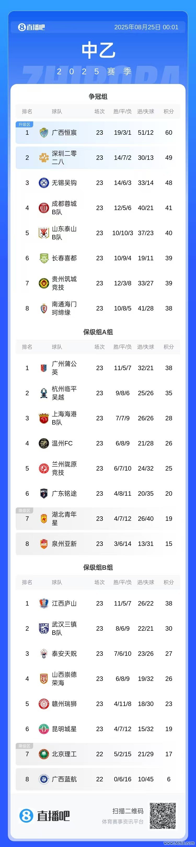 中乙第23轮综述:广西恒宸和深圳二零二八继续占据争冠组前二