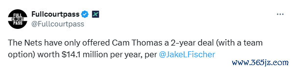 联盟又一个库明加式续约闹剧重演吗?篮网队23岁新星卡梅隆-托马斯向球队索要年薪超过3000万美元的大合同,不过据名记Jake Fischer报道,篮网向托马斯提供了一份2年合同,均薪1410万美元,包含第二年的球队选项。