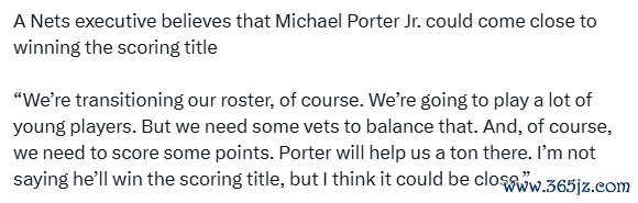 今夏篮网通过交易换来小迈克尔-波特以及选中德明等新秀,对于小波特的情况,一位篮网高管认为小波特新赛季有望赢得联盟积分 王,该高管表示:我们正在调整阵形 ,当然会启用很多年轻球员。但我们也需要一些老将来均衡 队伍。当然,我们需要积分 。小波特在这方面会给我们带来很大的帮助。我不是说他会赢得积分 王,但我认为他有可能接近这个目标。